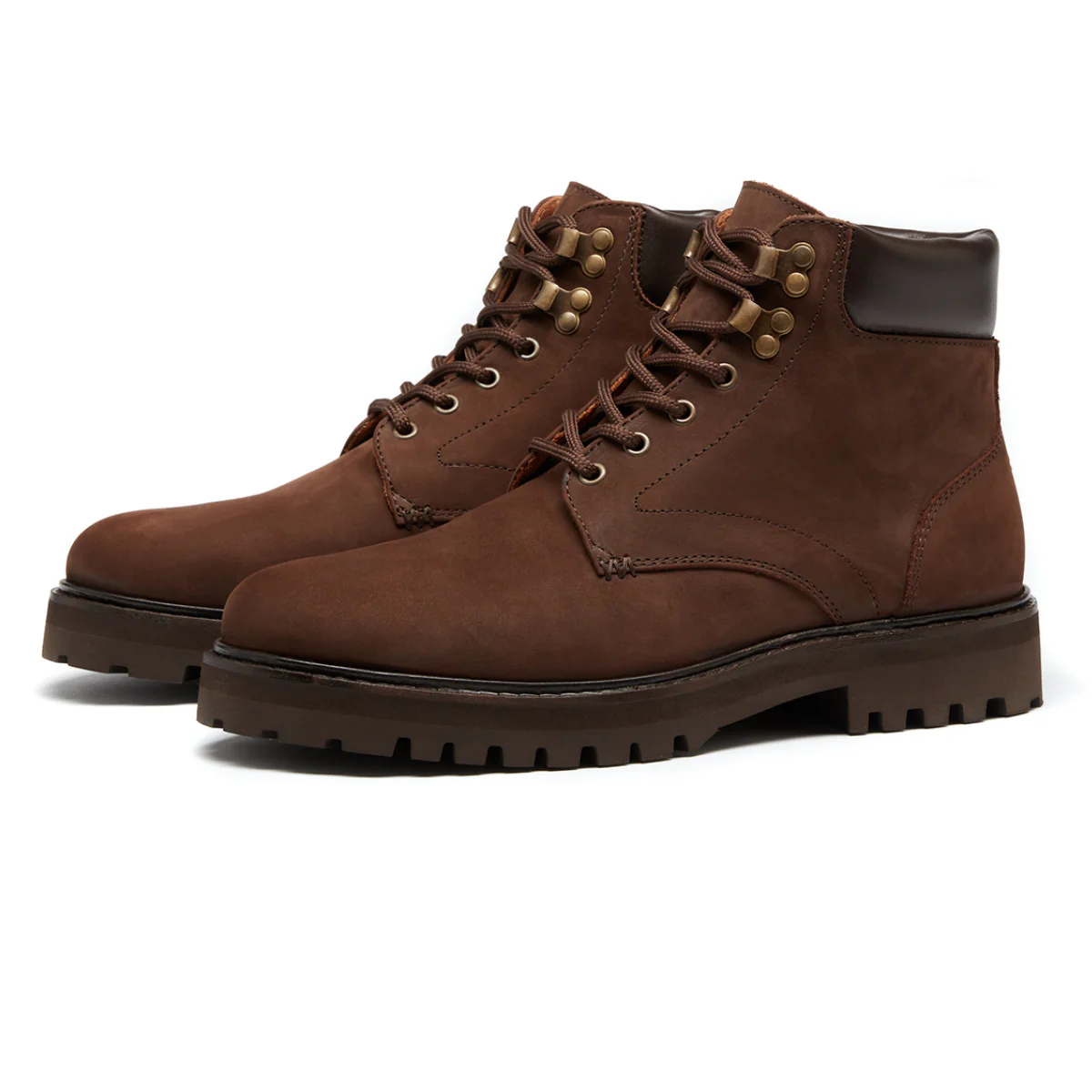 We took inspiration from a Forester work boot from the 1920s. This sturdy boot is Goodyear welted on a heavy duty, cleated commando sole, topped with a leather rand. To improve on the original, we've included an EVA midsole, which reduces the weight and will mould to the contours of your foot over time. The Derby upper is cut from a mocha brown nubuck, with a calf leather padded collar. Fully lined in calf leather with two top ski hooks in an antique brass finish.