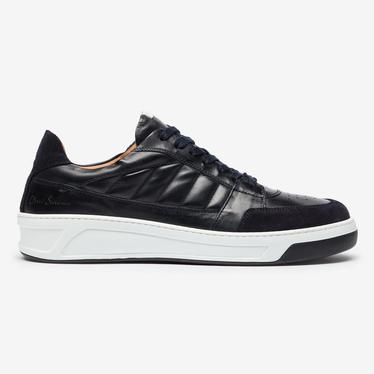 Our new trainer is made in Portugal from Garda leather from the great Incas tannery. This is a supple smooth calf leather in dark navy offset by a navy Mastrotto calf suede toe guard and trim at the heel. The upper is detailed with quilted side panels and a padded collar and tongue. Inside we’ve included a full calf leather lining and cushioned leather insock. The trainers are made in the traditional way and side stitched to a deep profile rubber cupsole with side panel detail and a black base.