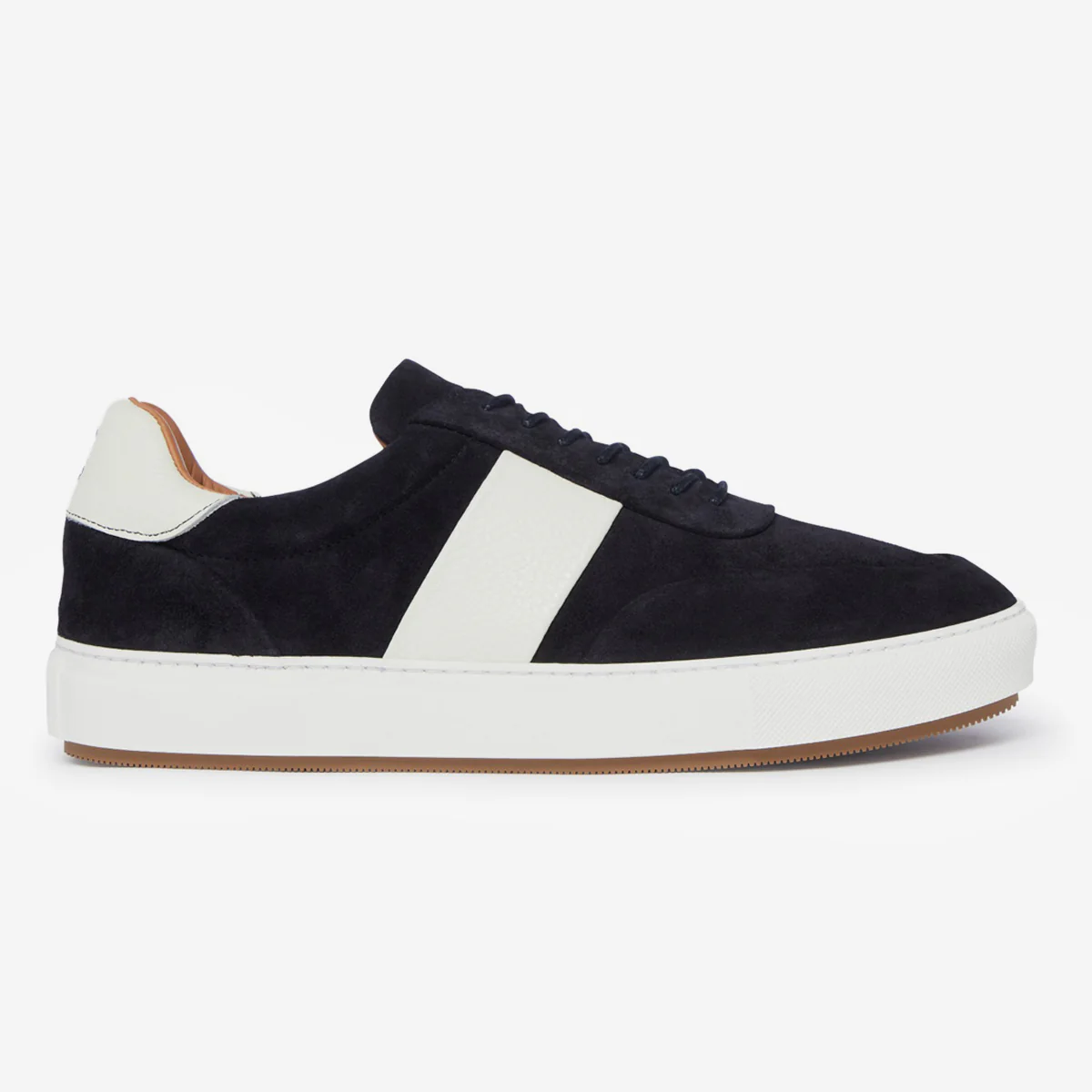 Carvao is our new cupsole trainer in navy calf suede with a white side flash and back collar. The folded upper seams and top-line create a clean, streamlined look. It's what's inside however that makes the difference; a full leather lining with a deep cushioned leather insock and internal padded collar and tongue.