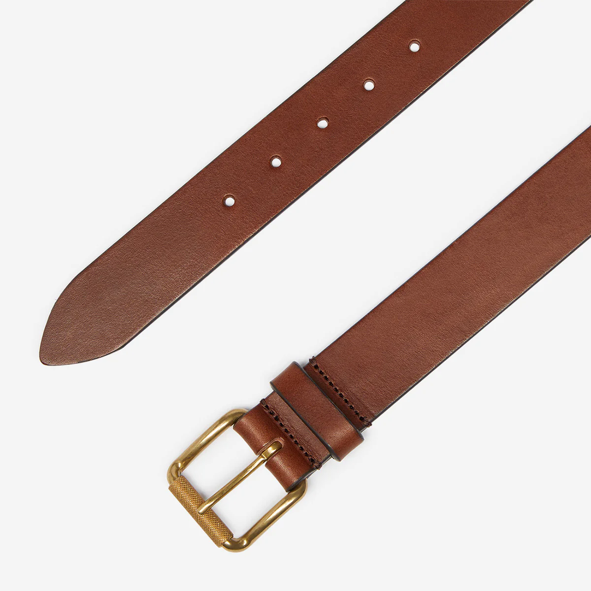 The leather is wrapped over the buckle and secured with twin stitch rows, which incorporate the belt loop.