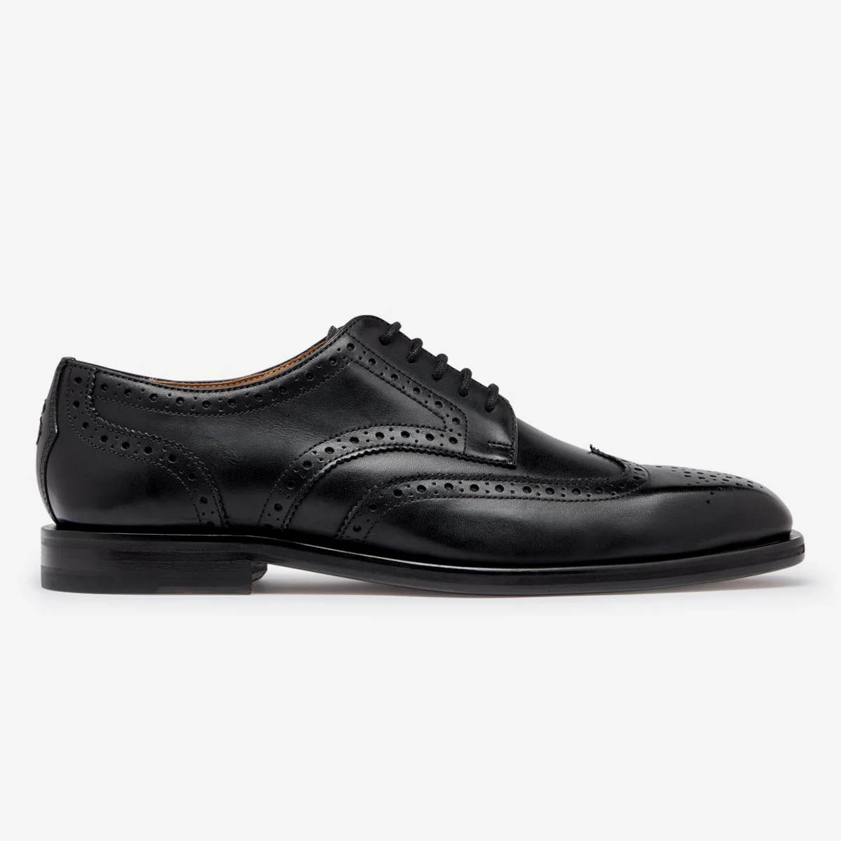Our classic Derby wingtip brogue is made from smooth black Adigo calf leather. The upper has traditional brogue punch detail with a toe medallion and is set on a formal last with a slightly squared, chiselled toe. We’ve included a half leather lining and padded leather half insock. The upper is Blake stitched to a sturdy leather sole with a rubber tipped leather stack heel.