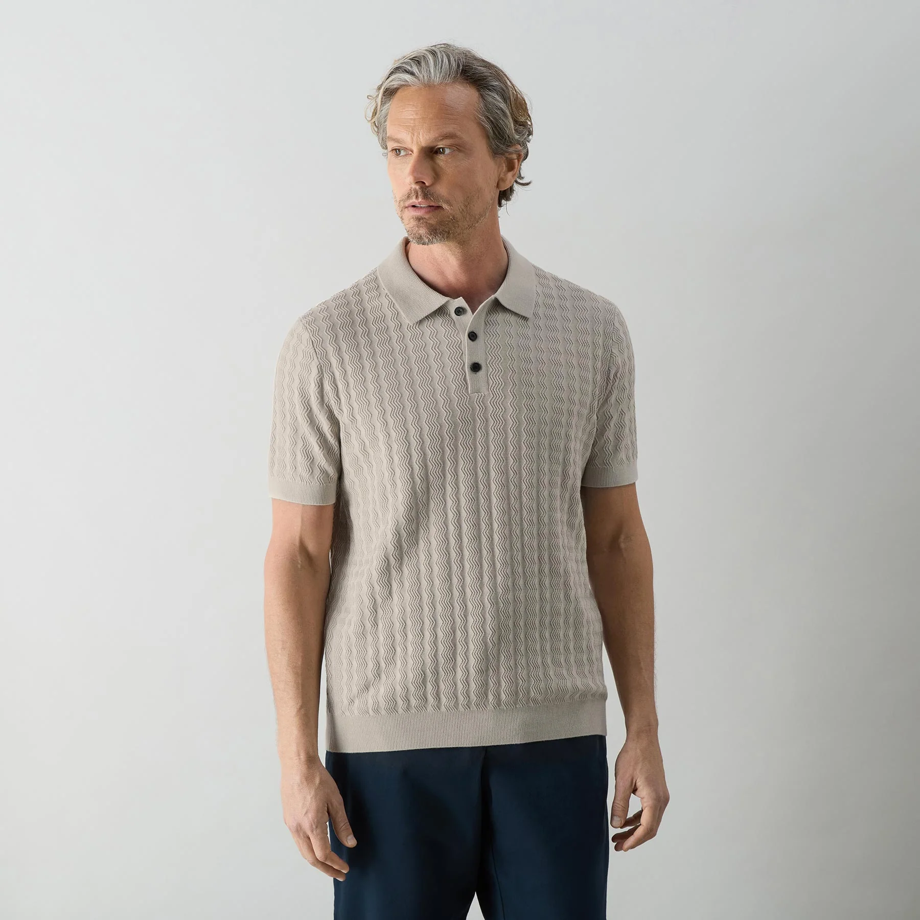 Our new cotton knitted polo shirt is made from a fine 100% cotton sone coloured yarn with a rack rib stitch forming a vertical zigzag relief pattern. The cuffs and hems are finished with a reinforced double rib and we’ve used a Milano stitch for the collar and placket – a dense double knit with great stability the shirt is finished with three natural horn buttons.