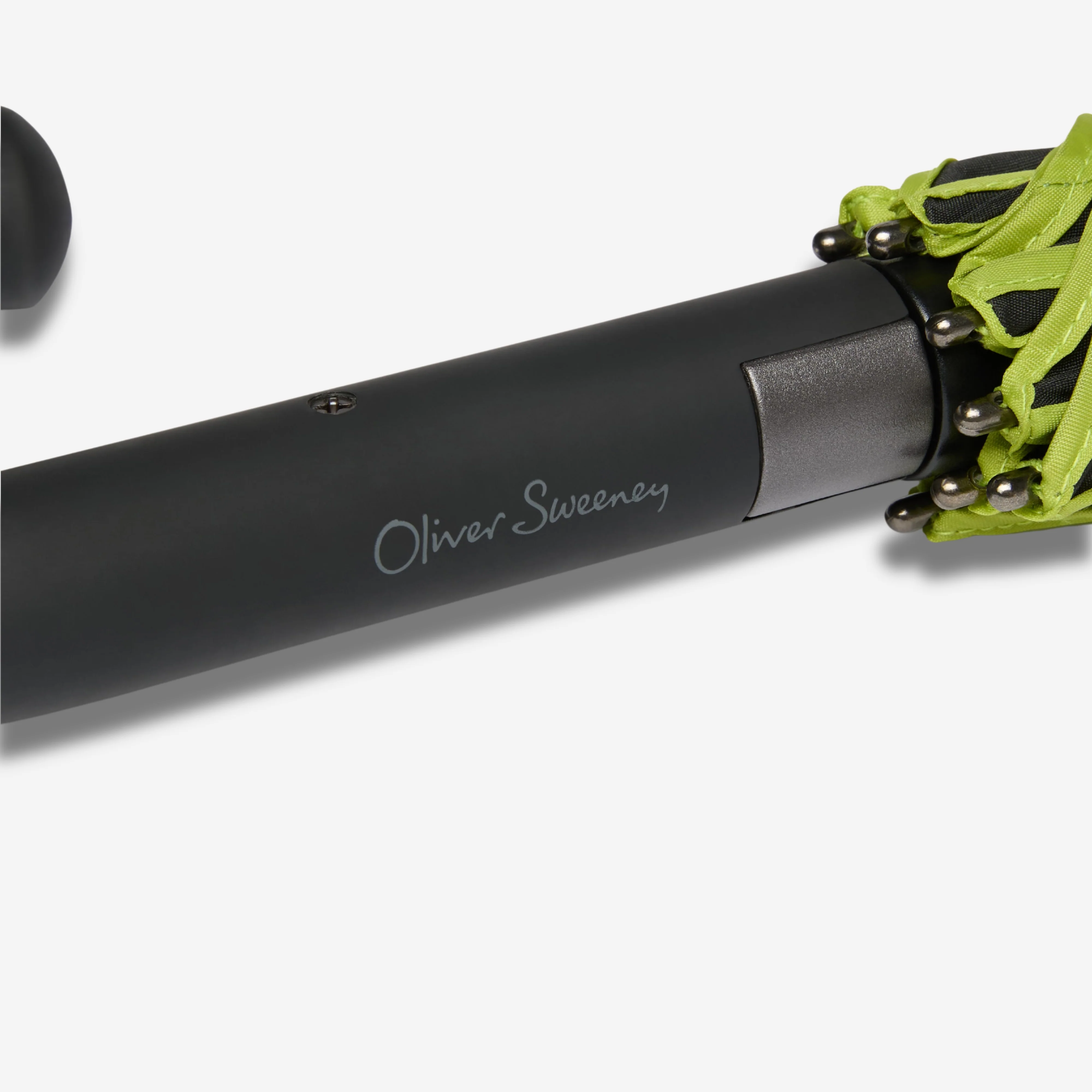 Our gentlemen’s umbrella has a sturdy, but incredibly lightweight steel and carbon fibre frame, built to withstand gusts and bluster. The generous (136cm diameter) waterproof synthetic black canopy is bound at the edges and seams with a reinforced binding in our signature Sweeney green. The umbrella opens at the push of the button on the lightweight black matt handle and pulls back easily to click shut.