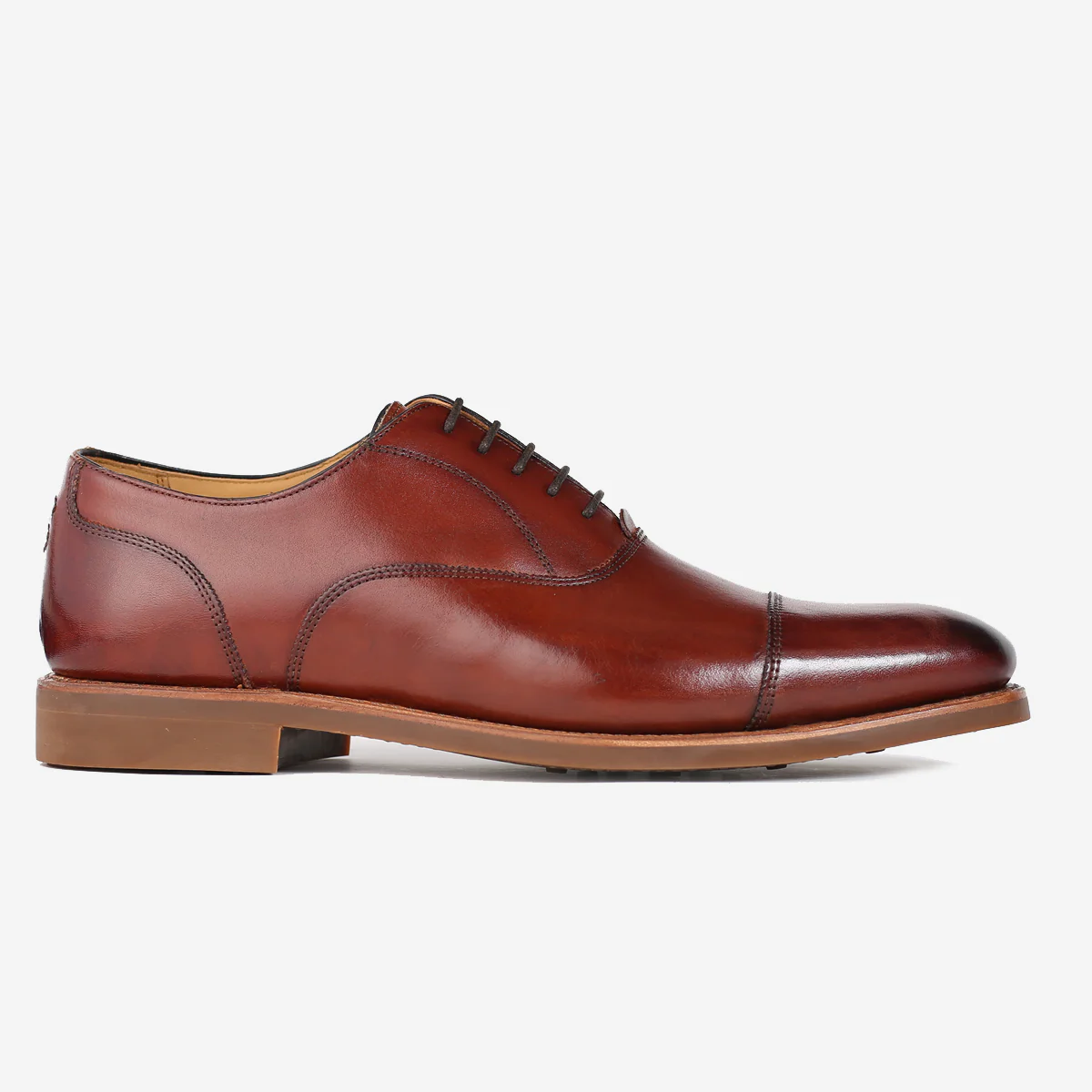 A timeless 5 eyelet Oxford toecap style in a hand antiqued, dark tan calf leather. The upper has neat twin row stitching around the facings, toe cap and heel counter, a piped topline and is finished in a formal medium sheen.