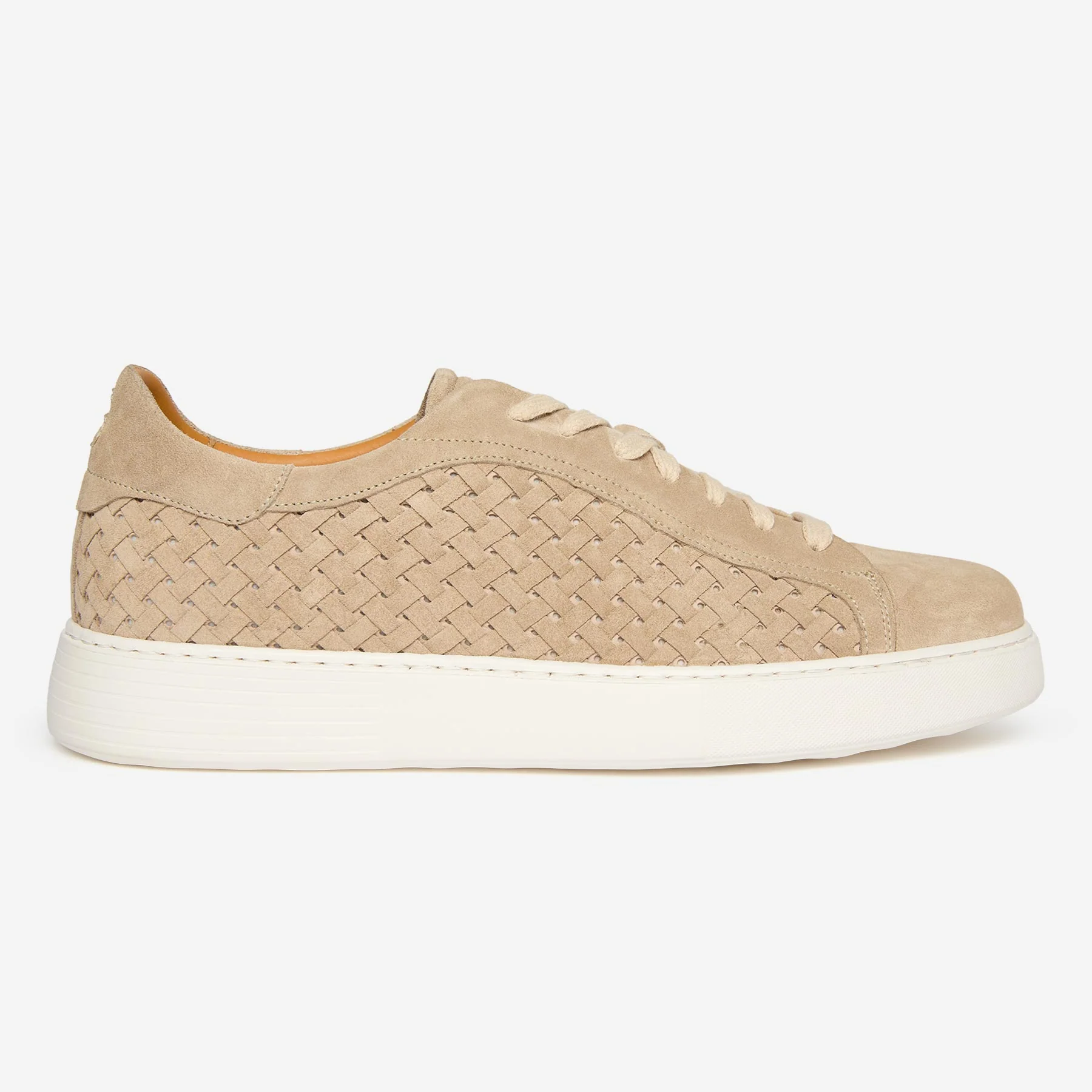 Our premium woven trainer is made in our specialist factory in Spain. Strips of soft calf suede are woven by hand to form a beautiful classic weave for the quarters. The remainder of the upper is formed of smooth suede with a neatly folded toe cap, bagged lightly padded topline and tongue. Inside is a full leather lining and insock. The white cupsole is made from a durable but lightweight compound and secured with a side stitch.