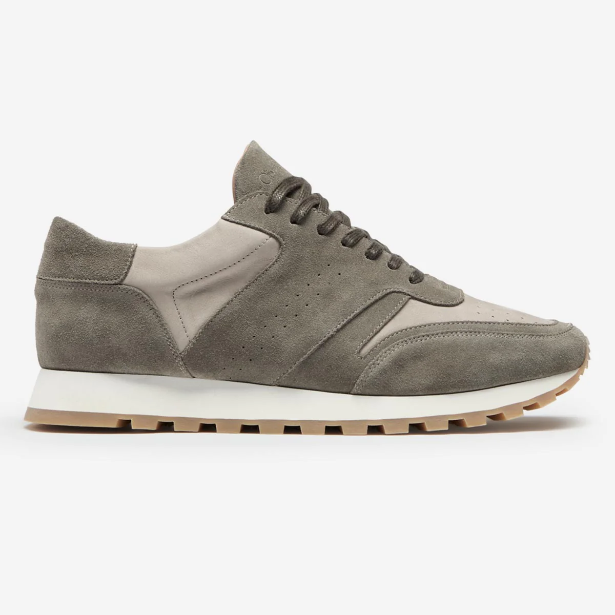 We've updated our lightweight runner for Spring by using fine, soft calf suede in a tonal khaki and stone. The supple suede is fully leather lined with a cushioned leather insock, padded collar and tongue to keep it all relaxed and comfortable. We've included some extra punch and stitch detail on the upper for a vintage aesthetic and reinforced the toe. The lightweight EVA midsole has a natural rubber cleated tread outsole.