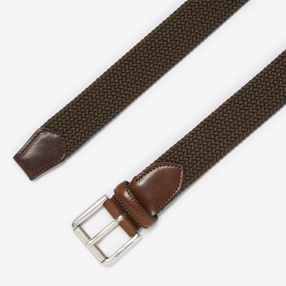 Our woven belt is designed to retain its shape, with a tight herringbone weave in sturdy elastic. The brass roller buckle has a silver finish with subtle etched branding and is set in brown calf leather with an integrated belt loop and matching leather trimmed tapered tail end.