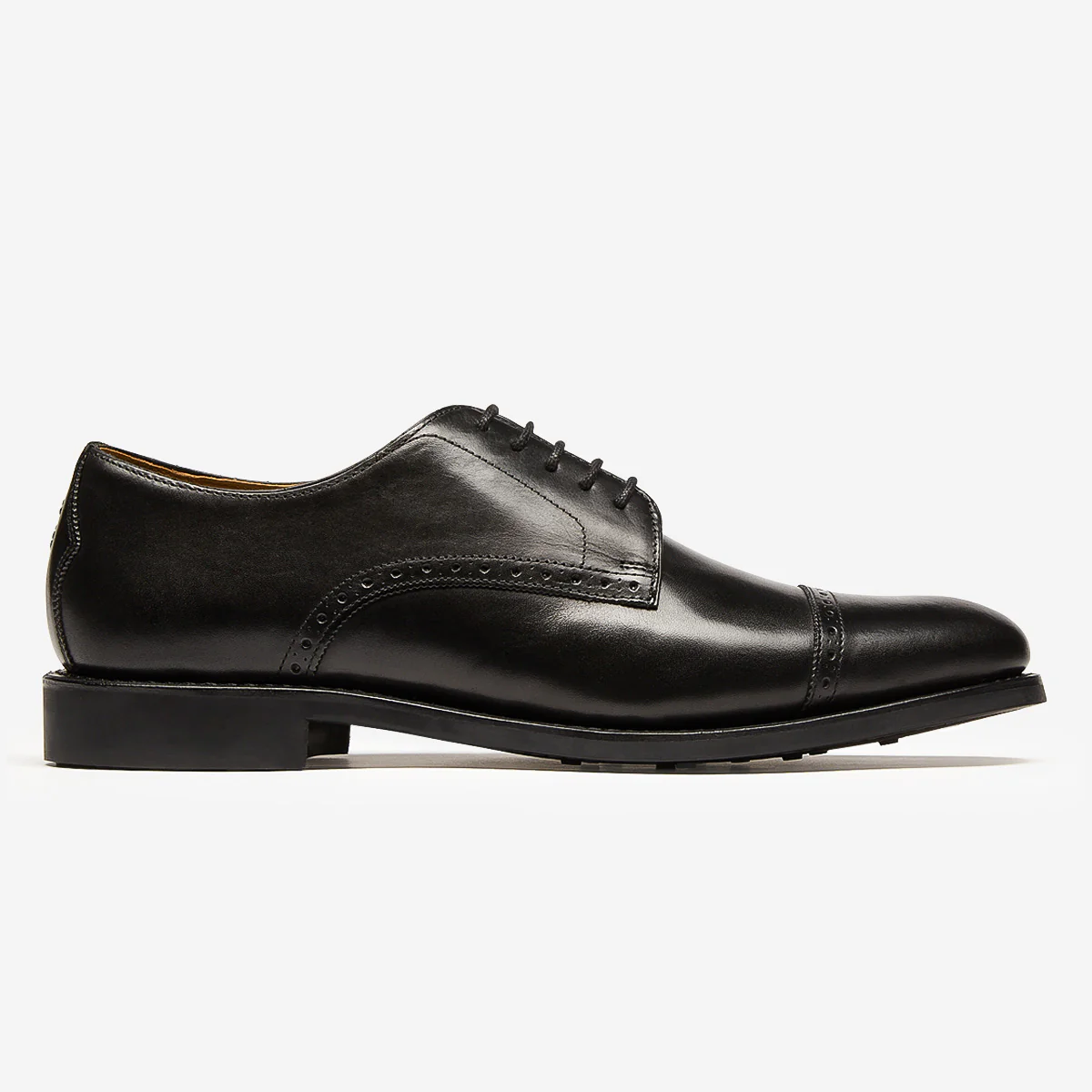 Our Temple toe cap Derby is classed as a ‘semi brogue’ as it has a toe cap instead of a wingtip. The brogue detail lifts the otherwise plain Derby, making it more versatile for both formal and less formal occasions. The black calf leather upper has a mid sheen and is fully leather lined in calf leather with a half leather insock. The upper is Goodyear welted to a practical Danite rubber sole.